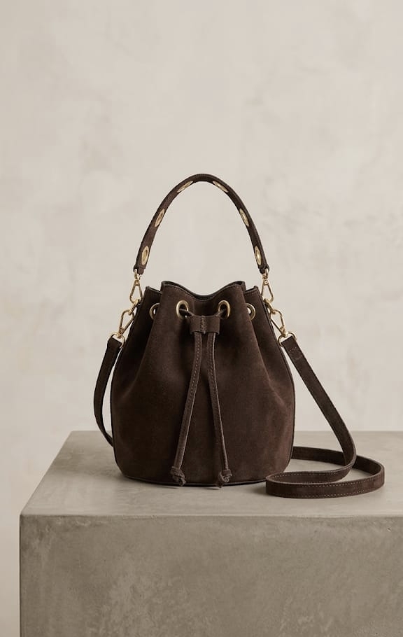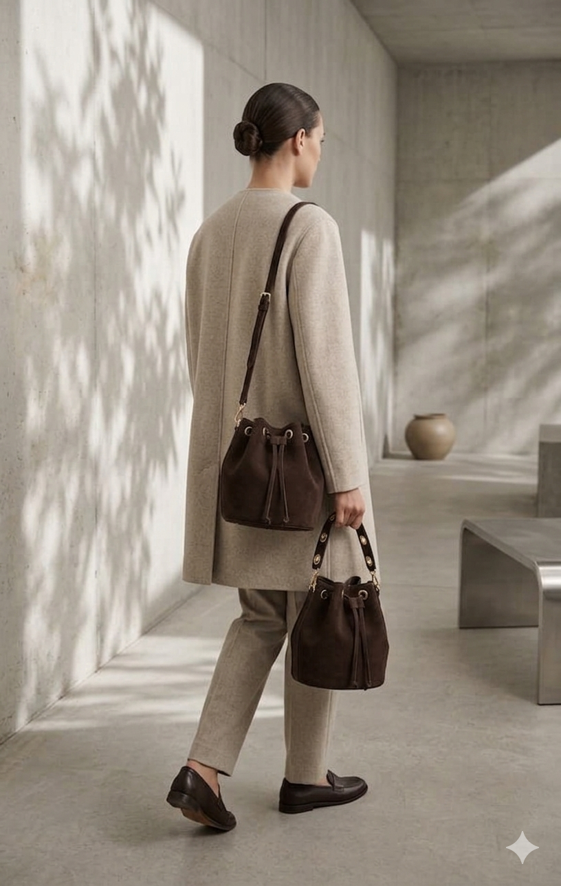 Eleva tu estilo diario con este sofisticado bolso tipo saco («bucket bag»), una pieza que combina la elegancia atemporal con una funcionalidad moderna. Confeccionado en un ante de primera calidad en tono marrón chocolate profundo, este bolso destaca por su textura rica y suave al tacto. Su diseño estructurado pero flexible se realza con herrajes metálicos dorados brillante, creando un contraste lujoso y distintivo.