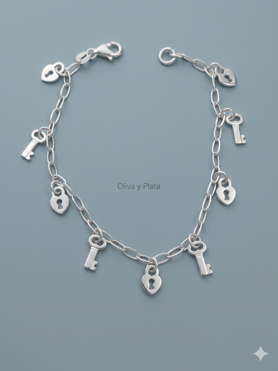 Diseño Exclusivo: Cuenta con una serie de charms detallados que representan corazones con cerradura y llaves antiguas, simbolizando amor, seguridad y nuevos comienzos.
