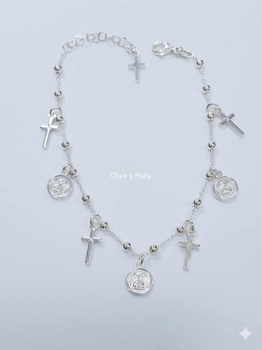 Diseño Simbólico: Cuenta con una serie de dijes colgantes que incluyen cruces de líneas limpias y medallas circulares de ángeles (inspiradas en el ángel Rafael), símbolos universales de guía y cuidado.
