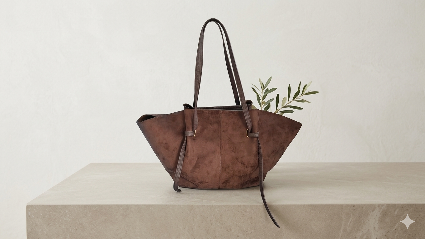 El equilibrio perfecto entre estructura y suavidad. Este bolso destaca por su silueta trapezoidal única y su textura aterciopelada, convirtiéndose en el protagonista de cualquier look otoñal o de estilo «quiet luxury».
